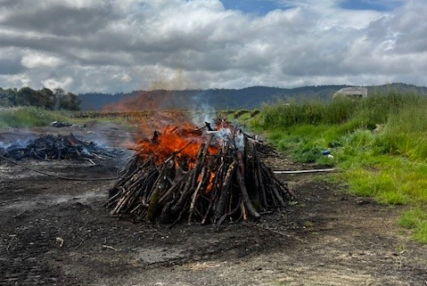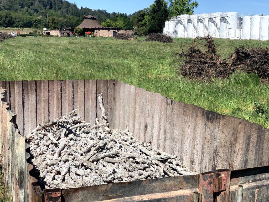 So far the Barra team has made two “batches” of biochar from older, less-productive cabernet and zinfandel vines that were cleared from other parts of their property to make way for new ones. After letting the uprooted vines thoroughly dry out for several weeks, they were “baked” for several hours in a four-sided, custom-made burn container under the watchful eye of Cal Fire officials. Their plan is to mix the biochar with pomace from grapes that were crushed at the winery last fall, and apply it this coming fall after new vines are planted on the site.