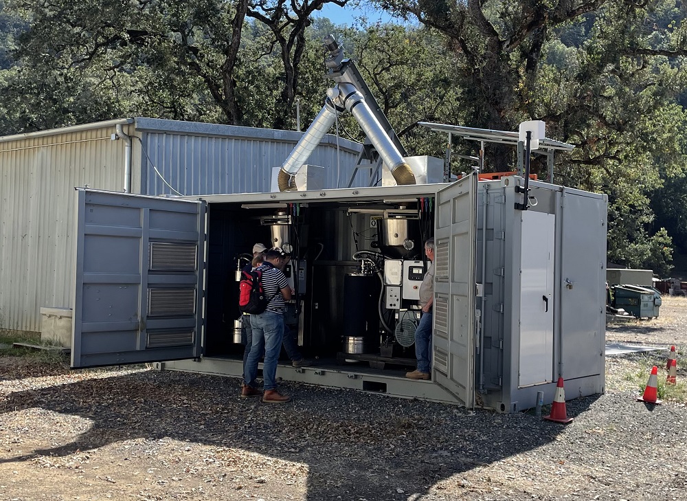 “A huge cost in making biochar is transporting the biomass out of the woods, so the idea is to have these small-scale distributed units right in the forest,” Bailey explained. “You’d have a tree crew that goes out and does their work chipping wood and feeding it through, then we’d either interconnect these units to the PG&E grid and do a net metering offset or charge large-scale batteries. So you’re not transporting the biomass a long way and you’re doing more localized production.”